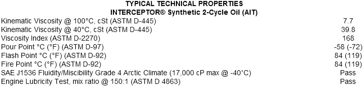 Two-stroke powersports equipment is meant to be ridden hard. Repeatedly pushing a machine to wide-open throttle during all-day, aggressive riding, however, takes its toll on the engine. INTERCEPTOR Synthetic 2-Stroke Oil is specifically designed for reliability and longevity in hard-ridden snowmobiles, dirt bikes, ATVs and PWCs, helping enthusiasts spend more time riding and less performing maintenance. Its low-smoke, low-odor properties help ensure riders won’t be "smoked out." INTERCEPTOR is compatible with nearly all other two-stroke oils and is recommended for most makes and models of two-stroke powersports equipment, eliminating the need to purchase and store multiple types of oil. It's an oil engineered to be pushed as hard as the equipment it protects.