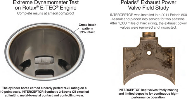 INTERCEPTOR was installed in a 2012 BRP® Ski-Doo® Renegade X snowmobile equipped with a Rotax E-TEC 800R engine. Following 50 hours of severe-duty engine dynamometer testing designed to simulate a full season of real-world conditions, the engine was disassembled and rated for deposits, wear and other distress by an ASTM calibrated rater. Each component earned a merit rating on a scale of 0 to 10 (with 10 representing no distress) or a percentage rating (with 0 percent representing no distress). Results prove INTERCEPTOR excelled at inhibiting deposits and wear. See the complete dyno results at amsoil.com/proof.